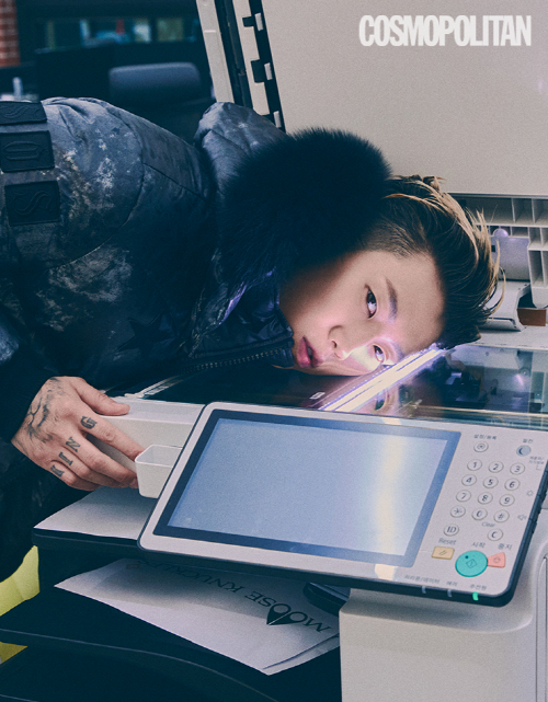 화보 속 박재범은 화려한 코발트 블루, 라임 컬러의 푸퍼 재킷, 블랙 그레이 바디에 여러 가지 패치가 포인트로 부착된 퍼 장식 후드 재킷 등 무스너클의 2020 가을 컬렉션 룩을 다채롭게 선보였다.