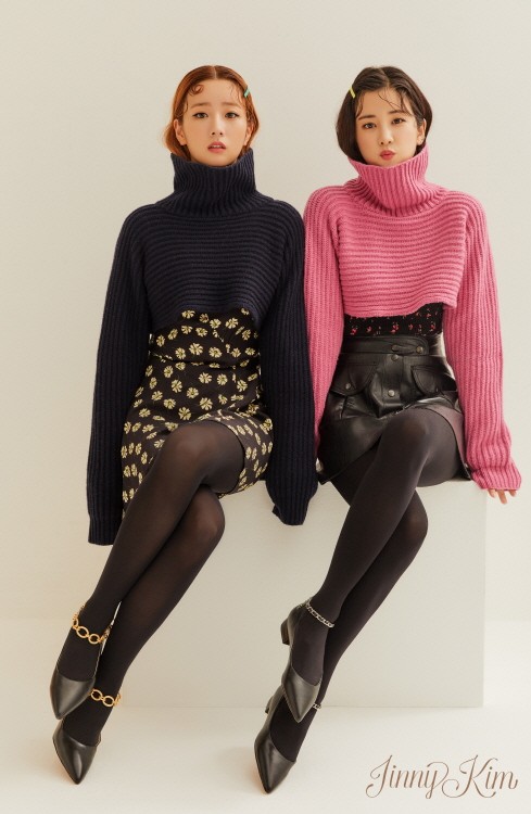 또 다른 화보에서는 플라워 원피스와 레더 스커트에 컬러만 다른 터틀넥 니트를 매치해 마치 쌍둥이가 연상되는 룩을 완성했다. 여기에 골드&체인 스트랩의 미들 힐로 쫙 뻗은 각선미를 강조하여 깜찍하면서도 페미닌한 무드를 보여주었다.