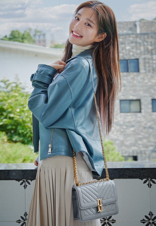 뿐만 아니라 가을 시즌 빼놓을 수 없는 가죽 재킷에는 톤 다운된 파스텔 블루 퀼팅 숄더백을 착용해 감각적인 톤온톤 스타일링을 완성했다.
