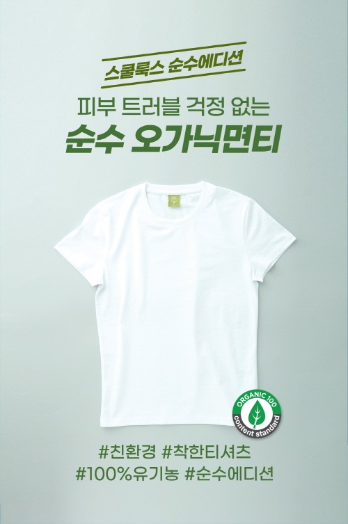 스쿨룩스(대표 오현택)가 업계 최초로 100% 오가닉 코튼 소재를 사용한 친환경 티셔츠 오가닉면티를 출시했다.