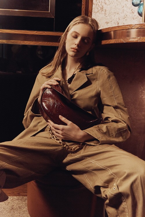 2021 봄 컬렉션은 여행을 하며 시시각각 변하는 빛과 그림자에 따라 보이는 형태에서 착안했으며 특유의 구조적인 쉐입과 섬세한 디테일로 재해석했다. 하드웨어는 장식성과 기능성을 동시에 갖춰 가방의 형태를 돋보이게 하거나 변형시키는 용도로 디자인 되었다. 또한 소프트하면서 은은한 광택이나 텐션감을 잃지 않는 카프 터치의 민자 가죽을 주로 사용하여 유니크하고 럭셔리한 텍스처를 더해준다.