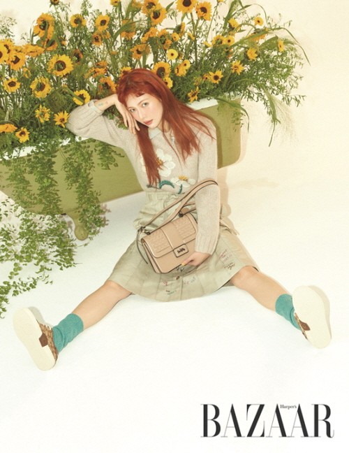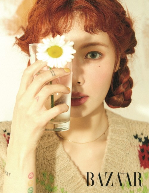 이번 화보는 해바라기가 가득한 동화 같은 공간, 그리고 그 속에 들어간 엉뚱하지만 사랑스러운 현아의 모습을 담았다. 보는 이를 웃음 짓게 하는 사랑스러운 표정과 포즈, 또 말괄량이 삐삐를 연상케 하는 레드 컬러의 헤어까지. 현아의 사랑스러운 매력을 배가 시키는 요소들이 눈길을 끈다. 특히 현아는 매 컷마다 룩에 어울리는 헤어 스타일을 제안하고 또 다채롭게 연출하며 열정을 보여주기도 했다.